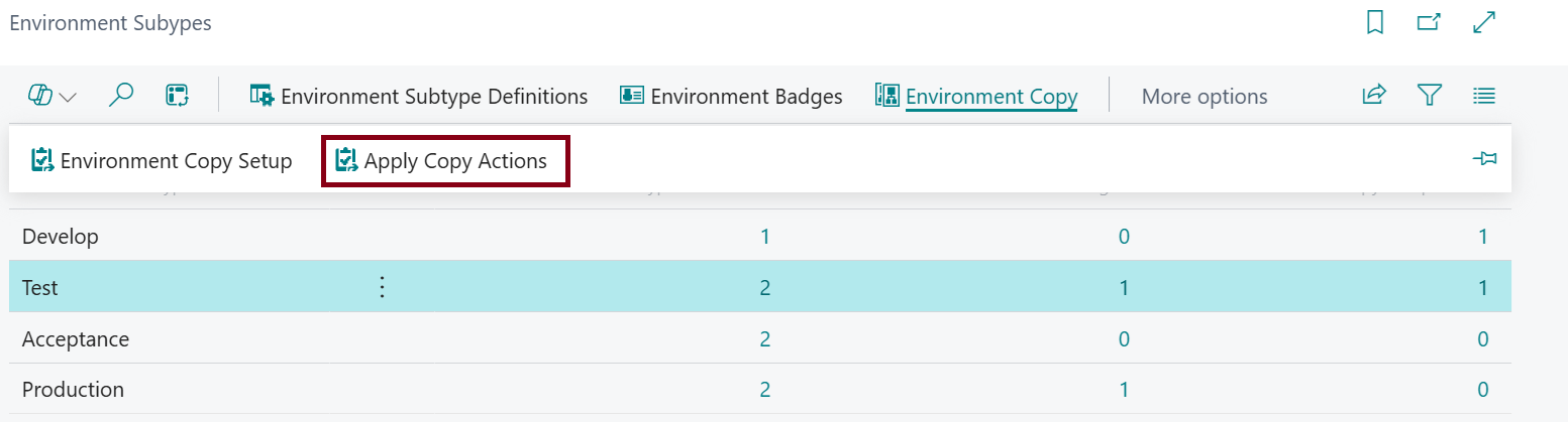 The settings are applied automically when the environment is copied. When you want to apply the settings on a later moment (because you have changed/added settings), you can use the Apply Copy Actions actionbutton: