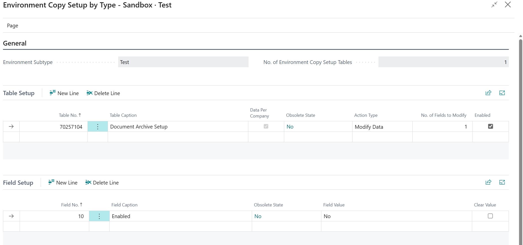 In the Table Setup part, you can define in whaht tables you want to replace values. In the example above, we want to disable the Document Archive app in the test environment. We want to do this for all companies within the environment, therefore we do not mark the "Data per Company" field.