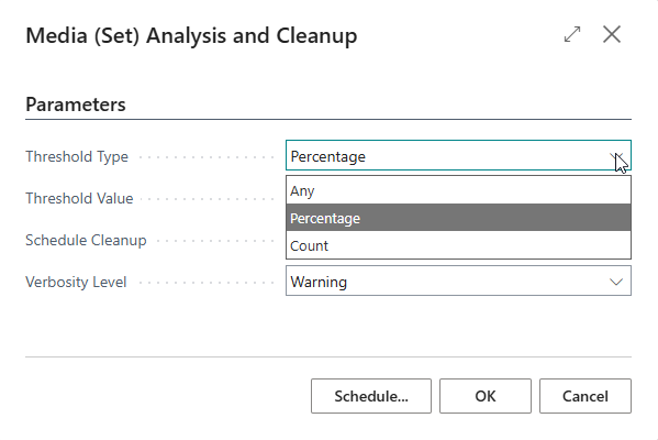 - Count When the number of either Media or Media Set orphans is reached Count with a threshold of 10 will not trigger when there are 9 Media orphans and 9 Media Set orphans. But will trigger when there are 10 Media orphans and 0 Media Set ophans. When one of the thresholds is reached, the report will trigger a telemetry message and if configured will schedule a clean up automatically. Whether automatic scheduling is triggered is added to the telemetry message as well.