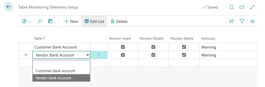 Standard the Telemetry Setup table changes are always monitored and sent. This is not configurable. In the Table Monitoring Telemetry Setup tables can be configured which will send telemetry on their specified actions: Insert, Modify and Delete. Currently, only Customer Bank Account and Vendor Bank Account can be selected.
